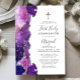 A borda esquerda deste elegante e moderno convite à primeira comunhão apresenta uma borda agitada de aquarelas em tons de azul, rosa e roxo, aspergidos com estrelas cintilantes e aparados com brilho falso prateado. Uma cruz de folha prateada falsa aparece acima do texto personalizável, que combina escrita manual, chapa e fontes itálicas em cinzas de carvão em um fundo branco. O lado inverso apresenta um design agate correspondente.