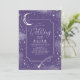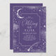 Convite de aniversário místico romântico prateado e roxo apresentando uma lua crescente, estrela cadente e galáxias.