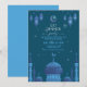 An Eid dinner invitation featuring a watercolor stary night with mosque and night stary sky with eid celebration graphic. The card is easy to customize with your wording, paper shape options, and choice of paper types. The soft color palette of the design looks stunning on the sript front while the blue contrasting backside makes this Eid party invitation truly unique.
