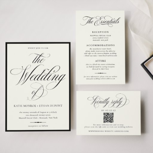 STATELY CALLIGRAPHY, The Essentials, wedding details information template enclosure card. Features, onyx black and soft ecru typography and background colors.
