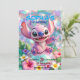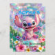 🌸 Invitation Description The image is an invitation card with a tropical, whimsical, and colorful theme, centered around the Disney character Stitch (from Lilo & Stitch). Character: A smiling, mischievous Stitch is featured prominently in the center. Theme: The background is lush and green with large, blurred tropical leaves and bright pink hibiscus flowers visible at the bottom. The atmosphere is festive. Color Palette: It uses bright, saturated colors, particularly vibrant blues, greens, and pinks. The background has an iridescent or holographic effect.