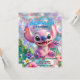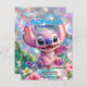 🌸 Invitation Description The image is an invitation card with a tropical, whimsical, and colorful theme, centered around the Disney character Stitch (from Lilo & Stitch). Character: A smiling, mischievous Stitch is featured prominently in the center. Theme: The background is lush and green with large, blurred tropical leaves and bright pink hibiscus flowers visible at the bottom. The atmosphere is festive. Color Palette: It uses bright, saturated colors, particularly vibrant blues, greens, and pinks. The background has an iridescent or holographic effect.