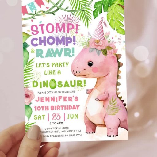Convite Stomp Chomp Rawr! Dinossauro 10ª garota rosa de an
