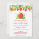 Este adorável convite apresenta morangos aquosos, verde e flores.
