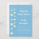 Um convite para chá de um bebê virtual mínimo, com bonito hortelã verde-menta-verde-amarela e cordas de coração com um fundo azul e o nome da futura mãe em um roteiro branco. Você pode personalizar facilmente o gênero do bebê esperado, o tipo de chá de fraldas e os detalhes do evento.