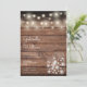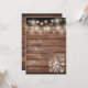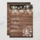 Um convite de casamento na moda rústico com luzes de cordas bonito e jarras de pedras. Os nomes dos casais felizes são colocados em um roteiro elegante acima dos detalhes especiais do casamento em um fundo de madeira rústica. O reverso apresenta um fundo de madeira rústica correspondente. Projetado por Thisnotme©