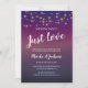Este belo e ousado convite de festas de elopetes será a forma perfeita de convidar seus amigos e família para uma festa de recepção! Este design apresenta um fundo roxo, luzes de cordas elegantes e texto branco em escrita manual e fontes de bloqueio. Faça uma declaração com este convite!
