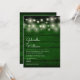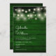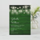 Um convite de casamento na moda rustic com luzes bonito de cordas acima dos nomes de casais felizes, em um roteiro elegante acima dos detalhes especiais de casamento em um fundo de madeira verde-esmeralda rústica. O reverso apresenta um fundo de madeira rústica correspondente. Projetado por Thisnotme©