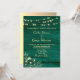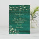 Um convite para casamento elegante, moderno e rústico de madeira esmeralda verde, com renda floral dourada, luzes de cordas e simples roteiro de caligrafia.