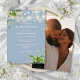 Este elegante eucalipto verde de corda botânica acende poeirento convite de casamento azul pode ser personalizado com sua informação em tipografia chica com sua foto especial no verso. Projetado por Thisnotme©