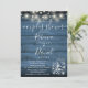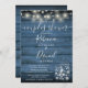 Um convite para chás de casamento rústicos com luzes bonito de cordas e frascos-pedras com tipografia de na moda, sobre um fundo azul de madeira rústica. Projetado por Thisnotme©