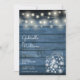 Um convite de casamento na moda rústico com luzes de cordas bonito e jarras de pedras. Os nomes dos casais felizes são colocados em um roteiro elegante acima dos detalhes especiais do casamento em um fundo de madeira azul-marinho rústico. O reverso apresenta um fundo de madeira rústica correspondente. Projetado por Thisnotme©