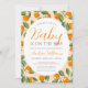 Este convite para chás de fraldas de laranja giro apresenta laranjas de citrinos em vinhas de folha verde com flores brancas em fundo de laranja pastel. Uma letra moderna de escrita de caligrafia adiciona um toque de capricho a este doce convite de chá de fraldas de verão.