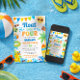 The bold, playful typography paired with whimsical water splashes creates a fun and energetic look that’s perfect for a backyard splash pad party, pool celebration, or lakeside birthday bash. This invitation is designed with a clean white background and colorful border illustrations for a bright, crisp finish.