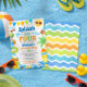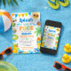 The bold, playful typography paired with whimsical water splashes creates a fun and energetic look that’s perfect for a backyard splash pad party, pool celebration, or lakeside birthday bash. This invitation is designed with a clean white background and colorful border illustrations for a bright, crisp finish.