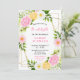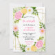 This fun and whimsical birthday party invitation features watercolor pink, yellow and white flowers with foliage on a gold geometric frame. The text combines handwritten script and serif fonts for a stylish and modern look. This is perfect for a spring or summer rustic birthday party.