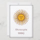 Este cartão do convite de festas do CHURRASCO tem um design brilhante e alegre que caracterize um grande sol alaranjado dourado com uma cara ilustrada, raios de luz solar que espalham para fora do centro. O sol é baseado no Sun de maio (solenóide de Mayo) que aparece na bandeira de Argentina e em um sol similar na bandeira de Uruguai.