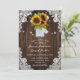Convite de casamento russo para girassol apresentando um dentro de girassol buquê de mason jar contra um fundo de madeira de celeiro adornado com rendas florais brancas e luzes de cordas. Design de cartão perfeito para convidar seus hóspedes para sua festa de casamento temerária inspirada pelas flores de girassol. Design totalmente personalizável.