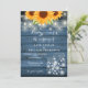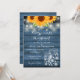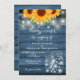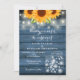 Apresentando bonito girassóis, luzes de cordas, frascos-pedras e buquês de flor silvestre sobre um fundo de madeira azul-marinho rústico. Este convite elegante de casamento pode ser personalizado com a sua informação especial do dia do casamento. O reverso apresenta as iniciais do seu monograma num girassol correspondente. Projetado por Thisnotme©