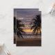 Uma cena de pôr do sol de uma praia impressionante com um céu ouro e roxo, ondas de oceano calmas, e uma silhueta negra de uma palmeira à direita. As matizes quentes refletem sobre a água, criando uma atmosfera romântica e serena — perfeita para um convite de casamento.