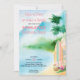 Convite de aniversário de surfe para a festa de aniversário de menina - perfeito para uma festa de praia, festa de piscina, amante de água, tema do oceano etc. Aquarela design tem uma cena de praia sonhadora com pranchas de surf, acessórios de verão e rabo de cavalo de coco com tipografia química.