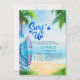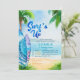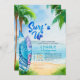 Convite de aniversário de surf que você pode personalizar para qualquer idade. Design apresenta cena de praia aquarela com oceano, palmeiras e pranchas de surfe e legal inscrições. Design neutro por gênero para o aniversário de um menino ou festa de aniversário de uma menina e perfeito para o tema de surfe de verão, tema oceânico, sob o mar, festa de praia ou festa de piscina.