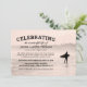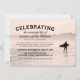 A celebração personalizada de surf de convites vitalícios é perfeita para informar a família e os amigos de um serviço funerário/memorial. Este convite apresenta uma praia sombria, o oceano, um surfista, e uma celebração da vida do modelo que pode ser facilmente personalizada com seus próprios arranjos.