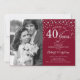 Convite de Surpresa de 40º Aniversário de Casamento com Foto. Design elegante em vermelho rubi e prata com fonte de caligrafia e confetes. Pode ser personalizado para mostrar qualquer ano de casamento. Saúde por 40 anos!