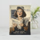 Uma ilustração ao estilo da vintage de uma mulher de olhos largos em traje controlado, reagindo dramaticamente a algo chocante no jornal que ela está segurando.