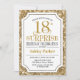 Surpresa 18º Convite à Celebração de Aniversário. Design elegante em branco e padrão de ouro brilhante. Apresenta uma fonte elegante de script. Envie-me uma mensagem se precisar de mais personalização.