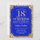 Surpresa 18º Convite à Celebração de Aniversário. Design elegante em azul real e padrão de ouro brilhante. Apresenta uma fonte elegante de script. Envie-me uma mensagem se precisar de mais personalização.