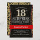 Surpreenda o 18º Convite de aniversário Elegante do design de em ouro falso brilhante, preto e vermelho.