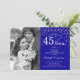 Surpresa 45º Convite de Aniversário de Casamento com Foto. Elegante design no sapphire azul real e prata com fonte de script e confete. Pode ser personalizado para mostrar qualquer ano de casamento. Saúde para 45 anos!