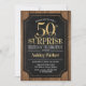 Rustic Surprise 50th Aniversário Celebration. Design elegante em ouro brilhante preto e fino e padrão de madeira castanha escura. Apresenta uma fonte elegante de script. Envie-me uma mensagem se precisar de mais personalização