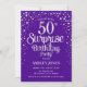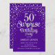 Surpreenda o 50º Convite de aniversário. Design elegante em roxo real e prata brilhante falso. Possui fonte de script na moda e confetti. Envie-me uma mensagem se precisar de idade personalizada.