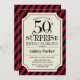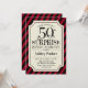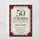 Surpresa 50º Convite à Celebração de Aniversário. Design elegante com listras vermelhas pretas e padrão de burlap. Apresenta uma fonte elegante de script preto. Envie-me uma mensagem se precisar de mais personalização.