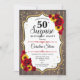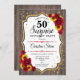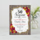 Surpreenda 50º Convite de Aniversário. Design branco, branco, vermelho e rústico feminino com ouro brilhante. Apresenta padrão de madeira, rosas vermelhas, girassóis, fontes de script e confetti. Perfeito para uma bolsa mensageifesta de aniversario elegante. Pode ser personalizado para mostrar qualquer idade. Envie-me uma mensagem se precisar de mais personalização.