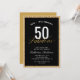 Esta elegante surpresa 50 e fabulosa convite de aniversário apresenta um design de brilho dourado acentuado com texto de script e um fundo preto.