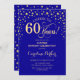 Surpresa 60º Convite de aniversário. Elegante design no sapphire azul real e ouro brilhante falso. Apresenta a fonte do script e os diamantes confetti. Saúde para 60 anos! Envie-me uma mensagem se precisar de mais personalização.