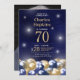 Ele é a estrela da noite!! Este fabuloso convite de festas de surpresa de 70 de aniversário para homens, com uma margem inferior de balões azuis e dourados marinhos, o número 70 em ouro, e uma foto do convidado de honra é perfeito para celebrar o homem no aniversário de 70 da sua vida. É tradicional e clássico enquanto é fresco, moderno e contemporâneo. Para personalizar, selecione simplesmente "Personalizar este modelo", carregue uma foto favorita e digite suas informações. É super fácil!