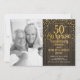 Convite surpresa de aniversário de casamento de 50 anos com foto. Design elegante com padrão de madeira rústica e dourado brilhante falso. Apresenta fonte de tipografia script e confetes. Perfeito para uma celebração de aniversário de cinquenta anos dourados com estilo. Personalize com seus próprios detalhes. Mensagem para mim se precisar de ano personalizado. Convites impressos da Zazzle ou modelo digital para impressão instantânea.
