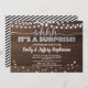 Elegante convite de festa surpresa prateado com design de luzes em fundo de madeira rústica. Design sofisticado.
