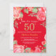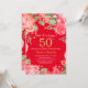 Red Floral Surpresa 50º Aniversário Convite para Mulheres. Flor Botânica De Aquarela Dourada Glitter. Flores Florais De Pêonias Rosa. Aniversário Adulto. Fundo Vermelho. Para mais personalização, clique no botão "Personalizar" e use nossa ferramenta de design para modificar este modelo.