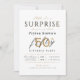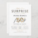 O convite para o aniversário de surpresa moderno apresenta a escrita de na moda e tipografia com os detalhes da sua festa em ouro sofisticado, preto e branco, simples e elegante, Excelente para a 50ª festa de aniversário ou qualquer outra idade,