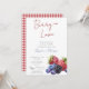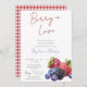 The layout showcases a vibrant red and cobalt blue color palette, complemented by a coordinating red gingham plaid pattern on the back for a cozy, rustic, farmhouse-inspired finish. Whether you're planning a chic bridal tea, a casual brunch, or a themed event such as “Love Is Sweet,” “Berry In Love,” or “Berry Excited,” this fully editable template allows you to customize every detail with ease.