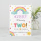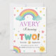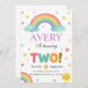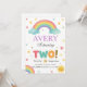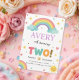 Celebrate your little one turning two with this cheerful and colorful Rainbow Birthday Invitation! This sweet design features a soft pastel rainbow nestled between fluffy clouds, surrounded by cute hearts and whimsical stars.