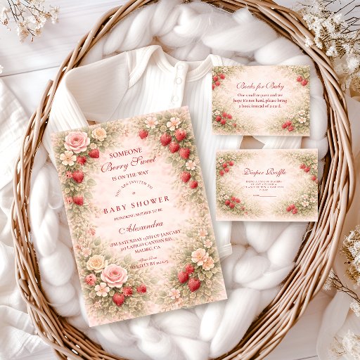 Celebrate a little one on the way with this charming strawberry-themed baby shower invitation. Soft blush tones, delicate florals, and sweet berry accents create a romantic, storybook feel that’s perfect for spring or summer gatherings. Fully customizable text makes it easy to personalize for any baby shower while keeping the design warm, joyful, and timeless.