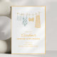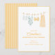 This bachelorette invitation features a watercolor illustration of swimsuits hanging on a clothesline — a tank, a printed one-piece, a yellow bikini, and a striped cover-up — with a gold border and all the party details below in warm yellow type. Perfect for a beach, pool, or destination bachelorette weekend.
