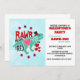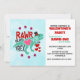 Um convite de festas com a imagem de um t-rex verde vestindo um chapéu preto com corações e flores ao redor. O texto diz que Rawr quer dizer que te amo em t-rex.