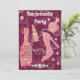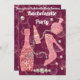 Uma garrafa de Champanhe Rosa moderna e elegante com elementos divertidos: Sapato de Dama, Perfume, Lápis Labial. O cartão também tem Pérolas brancas.